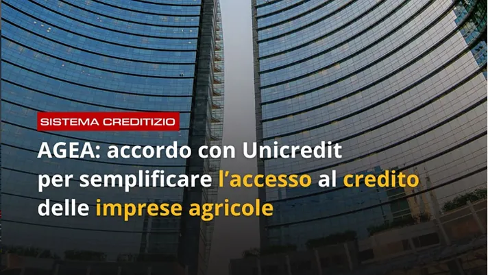 UniCredit e Agea hanno sottoscritto un protocollo d’intesa al fine di favorire e promuovere il supporto informativo ai processi bancari di analisi e concessione del credito alle imprese agricole e zootecniche operanti su tutto il territorio nazionale e un’offerta alle imprese di prodotti bancari sempre più innovativi e funzionali al contesto di settore e al panorama internazionale in cui le aziende agricole e l’intera filiera agricola operano.