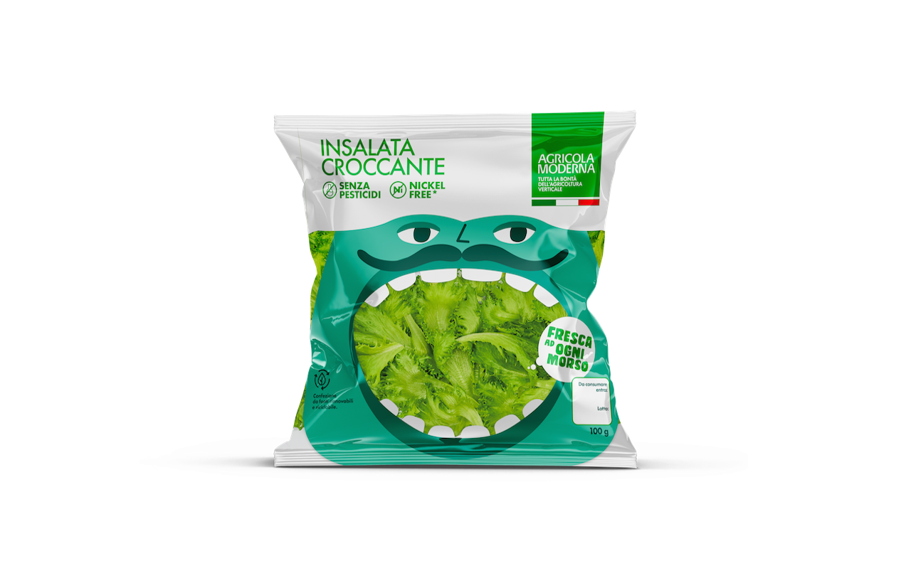 Le nuove grafiche delle confezioni hanno inoltre il pregio di comunicare chiaramente tutti i plus derivanti dal vertical farming, il metodo di produzione scelto da Agricola Moderna per le sue insalate e basilico, ovvero l’agricoltura indoor con metodo idroponico.