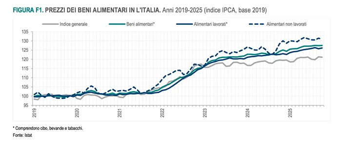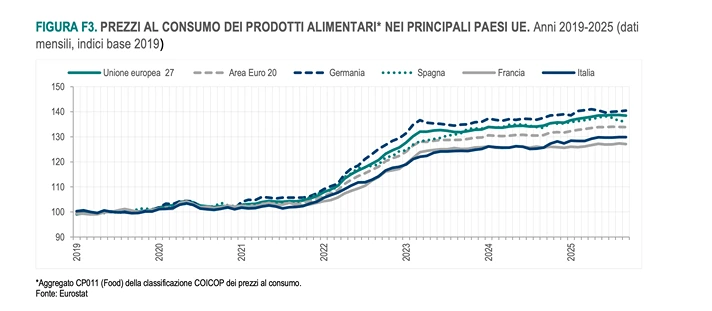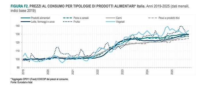 Negli ultimi due anni il prezzo al consumo degli alimentari (food) ha continuato a crescere ma a tassi sensibilmente più contenuti (+4,4% da settembre 2023 a settembre 2025).