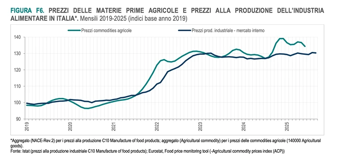 La crescita tendenziale dei prezzi alla produzione del settore alimentare industriale si è ridotta dalla metà del 2023 fino alla fine del 2024, collocandosi comunque al di sopra di quella delle materie prime alimentari. Successivamente i prezzi alla produzione, in presenza di rialzi di quelli delle materie prime alimentari, sono rimasti sostanzialmente stabili.