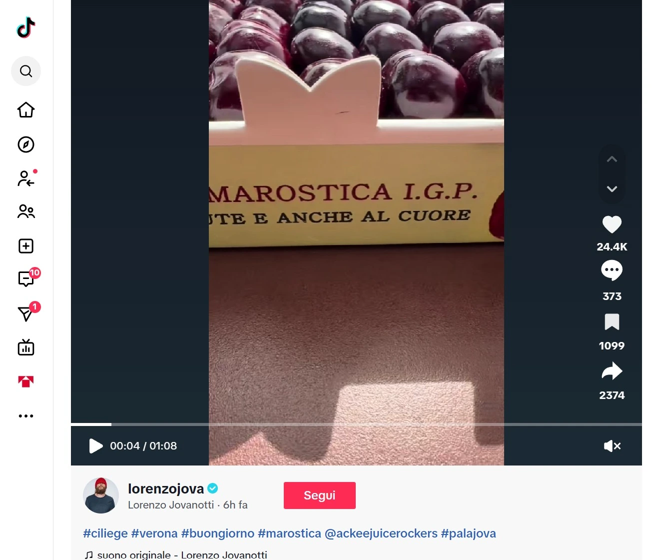 "La ciliegia di Marostica fa bene alla salute e anche al cuore", inizia così il suo reel su TikTok Lorenzo Jovanotti mostrando una cassetta dei frutti rossi che domenica parteciperanno al campionato mondiale di ciliegie.