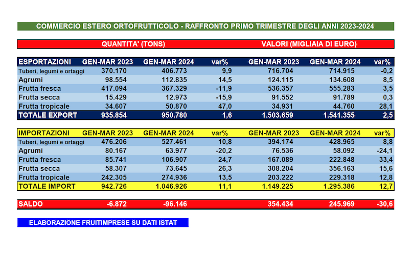 Le esportazioni italiane di ortofrutta fresca continuano a crescere nel primo trimestre 2024 sia in volume (+1,6%) che in valore (+2,5%) rispetto allo stesso periodo dell’anno precedente.