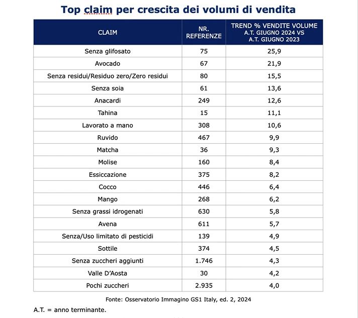 Secondo le rilevazioni, l’indicazione senza glifosato è quella che ha riscontrato maggiori consensi: in 12 mesi ha visto aumentare del 25,9% i volumi acquistati in supermercati e ipermercati. Il claim è stato individuato sulle etichette di 75 prodotti le cui vendite hanno subito un incremento, nei 12 mesi osservati, del 22,4% a valore, arrivando a quota 20 milioni.