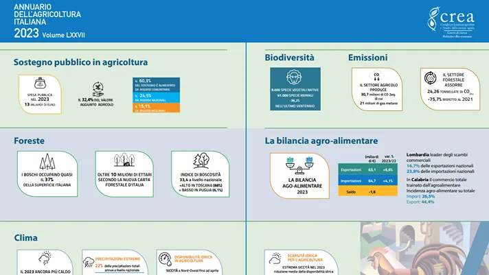 "Il 2023, nonostante gli andamenti climatici avversi e l’aggravamento della instabilità internazionale, è stato un anno in cui l’agricoltura italiana ha saputo reagire alle difficoltà, ridisegnando il proprio ruolo in un sistema agroalimentare in fase di rilevante crescita, in parte anche grazie alla nuova Pac, che punta molto sulla sostenibilità e per la quale come Crea forniamo supporto al Masaf per la formulazione degli interventi” - ha commentato Andrea Rocchi, presidente del Crea, intervenendo oggi alla presentazione.