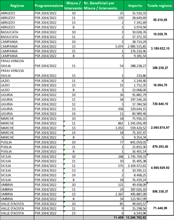 Valgono 13.246 milioni i fondi erogati da Agea per il Psr (Programmi di sviluppo rurale) della programmazione europea 2014-2022. Insomma il precedente ciclo di programmazione. Il decreto di pagamento è stato emesso il 21 maggio e interessa 11.409 beneficiari.