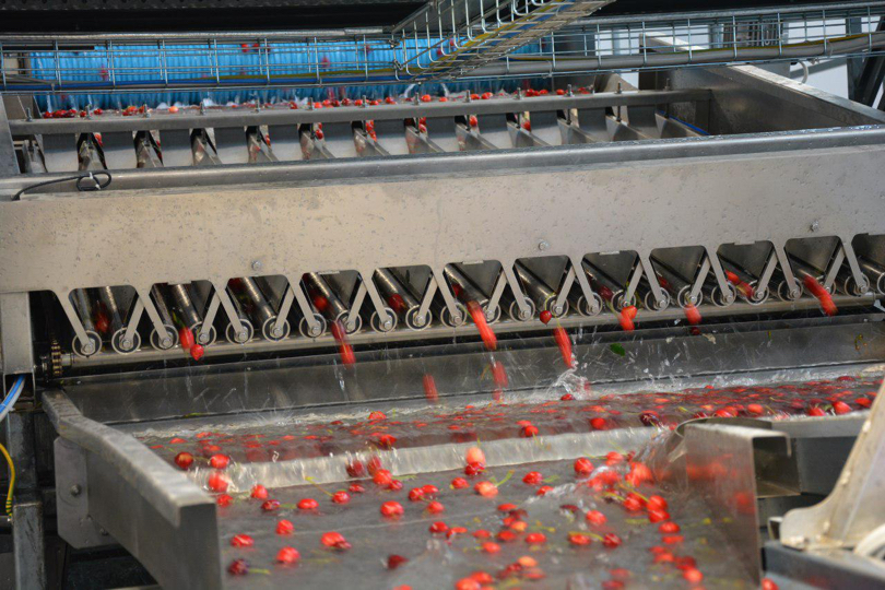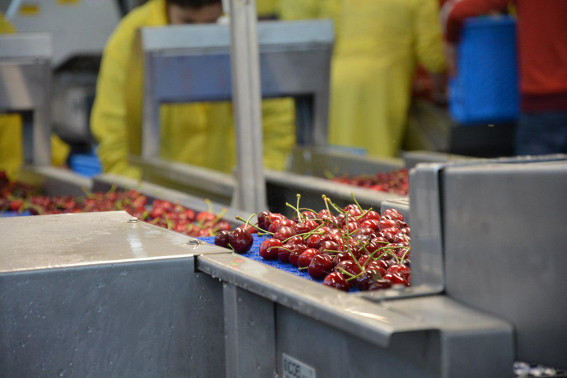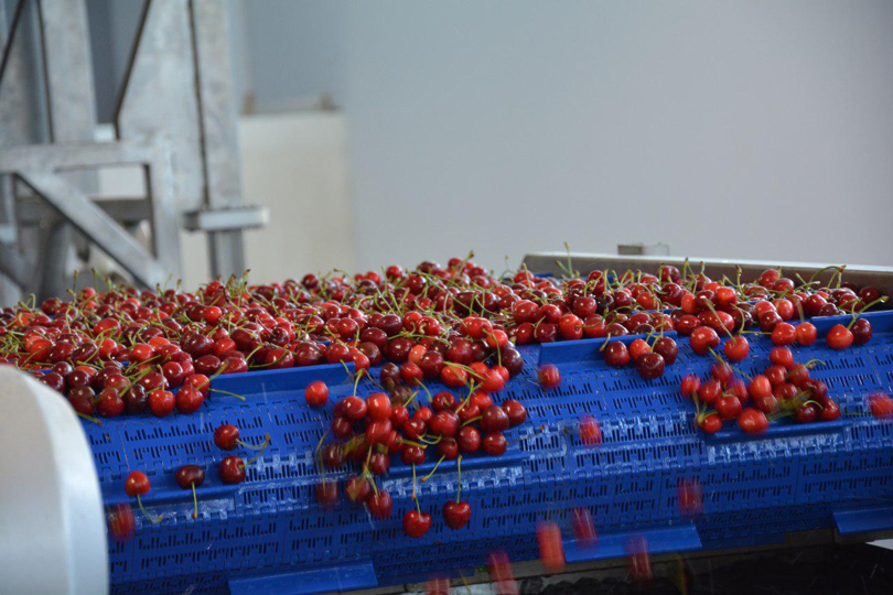 Il prodotto grezzo proveniente dalla raccolta viene introdotto nella linea attraverso macchinari innovativi che permettono lo svuotamento in acqua dando l’avvio all’intero ciclo di lavorazione. L’integrità delle ciliegie è garantita proprio dalla loro permanenza in acqua a temperatura controllata fino al confezionamento. Le altre fasi prevedono la divisione dei grappoli, attraverso una taglierina a lame rotanti, l’eliminazione del prodotto sottomisura e degli scarti della raccolta, la selezione per dimensione, forma, colore e qualità e il confezionamento con riempitori automatici di casse a peso ad alta precisione.