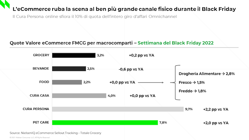 Nel mese di novembre, la crescita dell’e-commerce è guidata principalmente dal comparto pet (animali) e dal cura persona, settori digitalmente molto più evoluti rispetto ad altri, che continuano a registrare tassi di crescita tra il 20% e il 30% nel progressivo e tra il 20 e il 50% nel solo novembre.