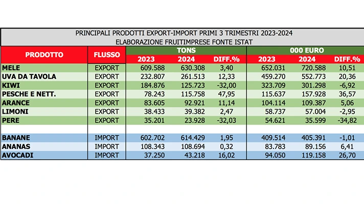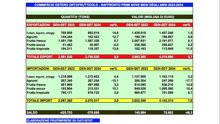 Cresce l’export di ortofrutta fresca dell’Italia nei primi tre trimestri del 2024, i dati Istat elaborati da Fruitimprese evidenziano un incremento rispetto allo stesso periodo dello scorso anno del 8,9% in volume (2.790.628 tons) e del 5,7% in valore (oltre 4,2 miliardi con un trend che accelera rispetto alle rilevazioni relative ai trimestri precedenti e potrebbe consentire alle nostre esportazioni di ortofrutta fresca di battere tutti i record e superare i 6 miliardi di euro a fine anno.