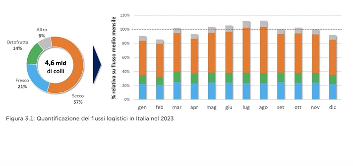 Partiamo da qualche numero. Nel 2023, la Grande distribuzione organizzata (Gdo) ha movimentato circa 4,6 miliardi di colli, con una prevalenza di merce secca (57%), seguita da fresco (21%) e ortofrutta (14%).