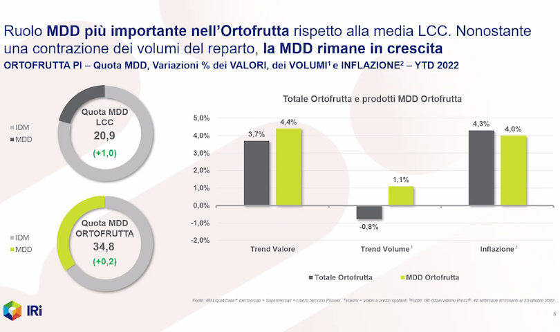 “In ortofrutta la Mdd raggiunge il 34,8% (+0,2), 14 punti in più rispetto al Lcc – ha aggiunto Binazzi – Se guardiamo all'interno del reparto, i volumi calano dello 0,8% ma, se guardiamo solo la Mdd, il trend è positivo (+1,1%) nonostante la stessa inflazione (4,3%). Per cui possiamo parlare di una ottima risposta da parte della Mdd all'interno del reparto e da parte del consumatore che ne riconosce la qualità”.