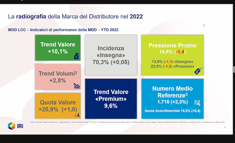 Intanto, continua la corsa del fenomeno inflattivo, soprattutto nella Mdd, superiore all'industria di marca (Idm). Gli impatti dell'inflazione sulla Mdd è al 7,5% (Ytd, 42 settimane terminanti il 23 ottobre 2022) ma al 15% sull'ultimo mese (4 settimane terminanti il 23 ottobre 2022) e al 17,1% nell'ultima settimana. “Questo, però – ha precisato Binazzi – non ha portato a cali di volume. Gli impatti negativi sull'Idm segnano -5,2% nell'ultimo mese contro il +2,2% della Mdd”.