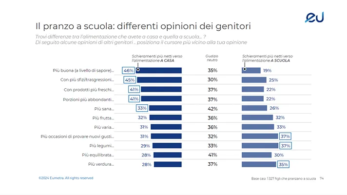 Secondo la ricerca Parents, realizzata da Eumetra in collaborazione con Camst group, su un campione rappresentativo di oltre 2mila genitori con almeno un figlio di età compresa tra zero e 11 anni o in attesa del primo, il 74% delle mamme e dei papà intervistati dichiara di consumare tra le mura domestiche piatti prevalentemente diversi da quelli che vengono serviti a scuola.