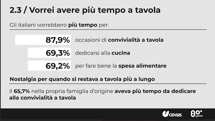 Sara Lena, ricercatrice del Censis ha illustrato i risultati principali del rapporto dove emerge che nonostante la fame di tempo "Il 70,2% degli italiani desidera rallentare il ritmo delle proprie attività. Il cibo si conferma un punto di riferimento fondamentale: il 95,3% degli italiani considera importante il tempo trascorso a tavola in compagnia, l’87,9% vorrebbe poterne avere di più. Inoltre, il 69,3% desidera più tempo per cucinare e il 69,2% per fare la spesa in modo più consapevole".