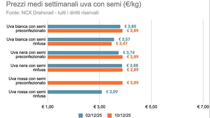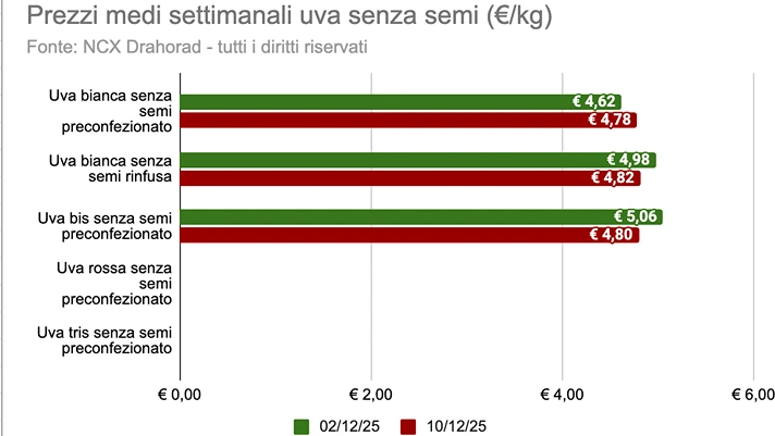 Le maggiori variazioni nei prezzi medi si sono riscontrate per: uva rossa con semi (+20,3%), uva rossa senza semi (-6,4%), uva bis senza semi (-5,0%).