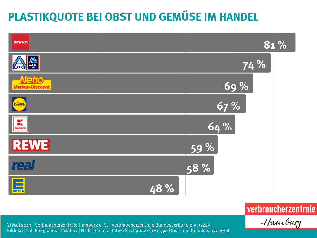 I discount sono coloro che usano più plastica negli imballaggi di frutta e verdura rispetto ai supermercati tradizionali. Ad esempio, da Penny Market (Rewe) o da Aldi secondo l'indagine vi è l'utilizzo più elevato di confezioni in plastica con una percentuale che nel primo caso è del'81% e nel secondo del 74%. L'insegna più virtuosa, invece, risulta Edeka con il 48%. Ma l'ulteriore evidenza, che secondo l'associazione è probabilmente anche più scoraggiante, è che, anche volendo, risulta molto difficile comprare la poca frutta e verdura sfusa in vendita, perché spesso più costosa di quella confezionata e “solo un terzo circa dei consumatori è riuscito a risparmiare non utilizzando la plastica”.