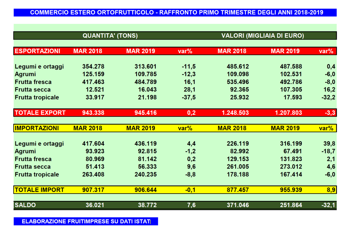 È iniziato così come era terminato il nuovo anno sul fronte dell'export ortofrutticolo, vale a dire con un segno negativo. Lo comunica Fruitimprese nel suo report sul primo trimestre del 2019 dove parla di un “appesantimento”della nostra bilancia commerciale.