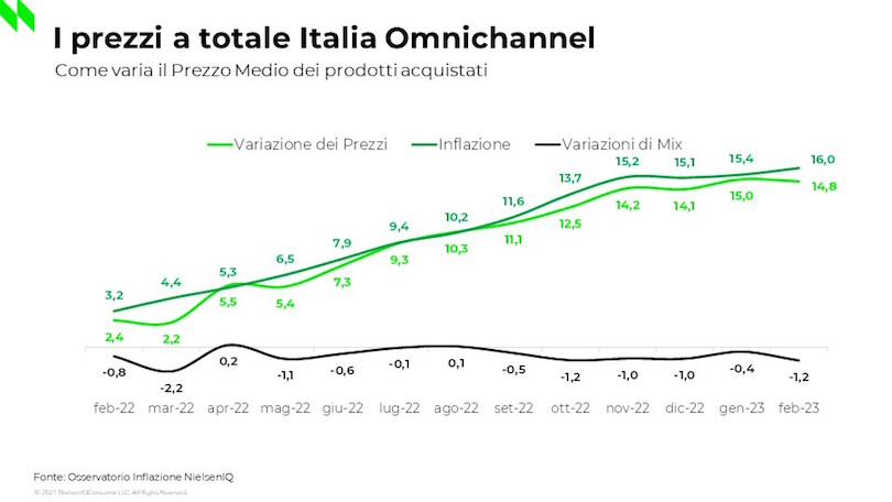 Stando ai dati di NielsenIQ, l’indice di inflazione teorica nel Largo consumo confezionato (Lcc), ossia il settore di mercato che comprende tutti i beni di consumo primario e i prodotti confezionati dall’industria, è pari al 16% a febbraio. Il mix del carrello della spesa si riduce dell'1,2%, con una variazione reale dei prezzi che si attesta al 14,8.