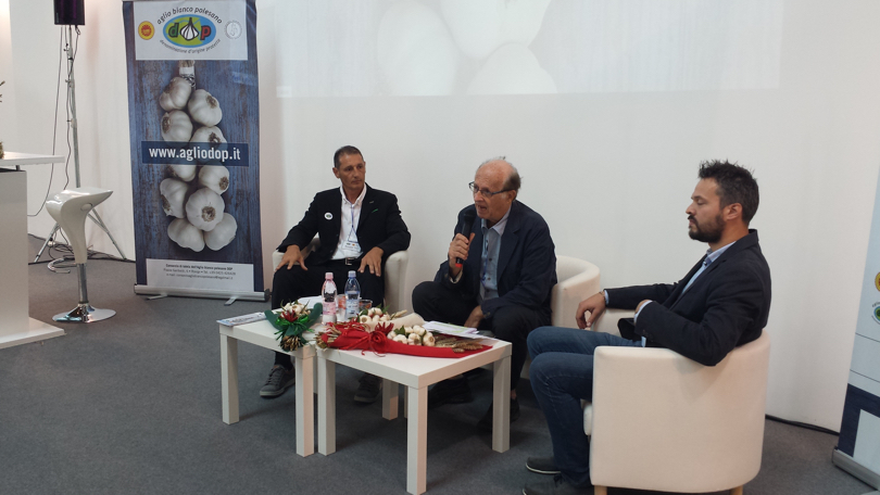 Il convegno a Macfrut. Da sinistra. Massimo Tovo, presidente del Consorzio Aglio bianco polesano, il giornalista e scrittore Giancarlo Roversi, Carlo Nicoletto ricercatore dell'Università di Padova