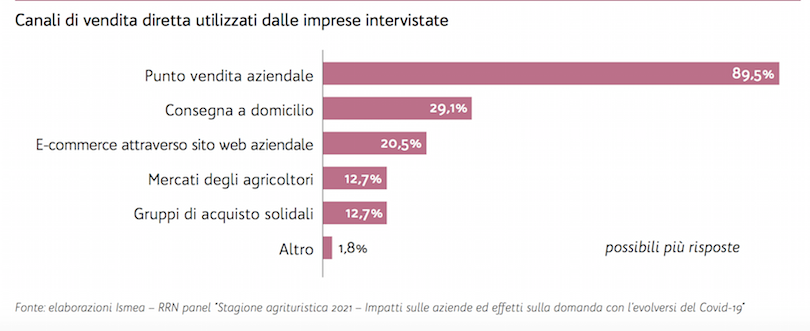 I dati sembrano confermare il più ampio utilizzo della vendita diretta da parte degli agriturismi rispetto al totale delle aziende agricole, per le quali la quota che utilizza questo canale è stimata intorno al 22% (Ismea, 2020).