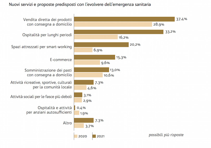 Il primo è la diversificazione dei servizi: per rispondere alle rinnovate esigenze della domanda, le imprese agrituristiche si sono concentrate sull’ampliamento del paniere dei prodotti e sull’ideazione di nuovi servizi: per il 2022 l’84% delle imprese, nonostante le complessità gestionali, prevede di integrare nuove attività per completare l’offerta. Il secondo trend riguarda la tipicità delle produzioni: è stato riscontrato un aumento di interesse e di richieste verso i prodotti agricoli di stagione, ma anche verso i metodi di coltivazione adottati e le certificazioni (in primis biologico). Cresce l’interesse verso le produzioni tipiche e a denominazione di origine e il desiderio di conoscenza dei processi di trasformazione. Molte imprese prevedono, per il 2022, di sviluppare la vendita diretta e la trasformazione dei prodotti aziendali. Il terzo trend è la consegna a domicilio ed e-commerce: l’utilizzo di internet e delle nuove tecnologie per gli acquisti da parte dei clienti ha indotto le imprese ad affidarsi maggiormente al commercio elettronico, tendenza che in futuro potrebbe ulteriormente consolidarsi anche perché, sebbene gli acquisti abbiano ripreso anche le loro forme più tradizionali (negozi, mercati e supermercati), una quota tramite delivery e online sembra essersi consolidata. Il quarto e il quinto trend riguardano, rispettivamente, l'ampliamento degli spazi per lo smart-working dei clienti e la filosofia ancora più green in tutte le attività proposte ai clienti.