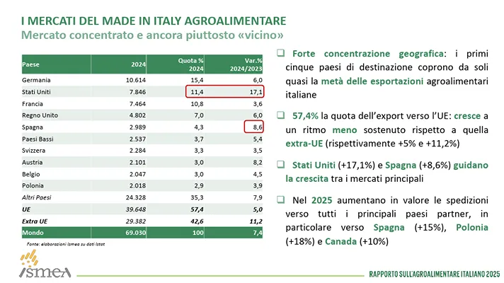 Un valore rilevante frutto di una maggiore vivacità dei rapporti con i Paesi extra Ue. Emerge infatti un quadro in cui l’Italia si sta spostando verso Paesi con economie in crescita o in buona salute. In ambito europeo, da segnalare la Spagna (+8,6%), ma emerge anche il ruolo prioritario degli Stati Uniti, dove nel 2024 le vendite di prodotti italiani hanno raggiunto 7,8 miliardi di euro, con un balzo del 17,1% sul 2023.