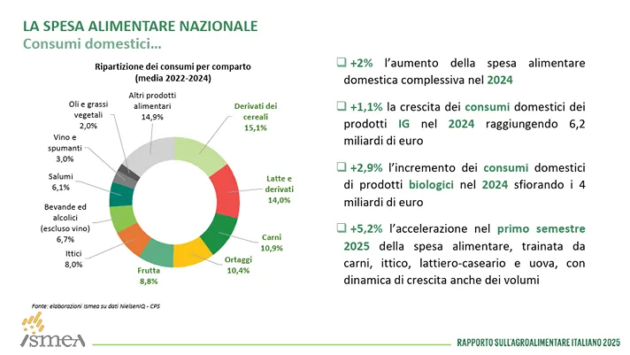 I supermercati restano il canale principale della spesa, ma la quota del discount  è cresciuta dal 15% al 23%. Forte l’interesse del mondo che ruota intorno agli aspetti di qualità e benessere con il biologico che era già cresciuto nel 2024 e cresce del +10% nel 2025. Nella spesa alimentare nazionale, gli ortaggi incidono per il 10,4% e la frutta per l'8,8%.