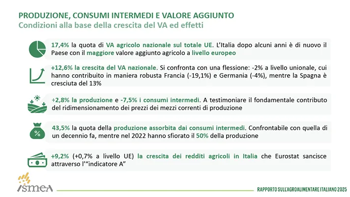 La crescita del volore aggiunto agevola anche la crescita dei redditi: + 9,2% l’aumento dei redditi in agricoltura, un dato che spicca rispetto a + 0,7% medio dell’Unione europea. “Il fatto che, in un decennio, il valore aggiunto dell’industria alimentare, sia crescito del 21%, è un indicatore di buona salute dell’ecosistema ”, ha sottolineato Fabio Del Bravo, della direzione filiere e analisi dei mercati Ismea. Cresciuta anche l'occupazione agricola: circa un milione di addetti nel 2024, +0,7% sul 2023.