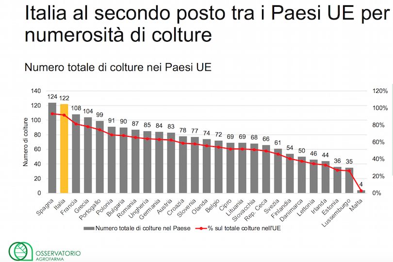 Secondo il report, l’Italia emerge in termini di biodiversità di colture presenti sul territorio, con 122 tipologie diverse mappate nel 2021-22. Con questi numeri, è seconda solo alla Spagna. In questo ambito ricoprono particolare rilevanza le colture minori, quelle cioè che hanno una sau (superficie agricola utilizzata) inferiore ai 10mila ettari. Tra queste, per quanto attiene l’ortofrutticolo, ci sono il melograno, lo spinacio da serra, il nespolo del Giappone e il ribes rosso.