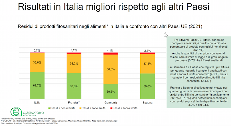 “L’Italia è il Paese che, in Europa, vanta il minor livello di residui di agrofarmaci negli alimenti – ha riferito Enrica Gentile, Ceo di Areté, società indipendente di ricerca, analisi e consulenza economica a cui è affidata la responsabilità scientifica del progetto – Nel 2021 il 99,3% dei campioni sono risultati pienamente regolari”.