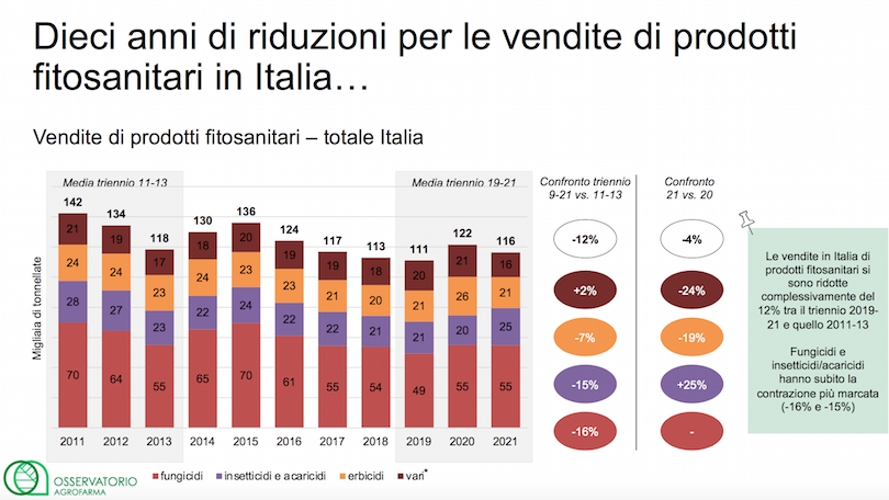 “Pur tutelando le rese, gli agricoltori stanno compiendo uno sforzo importante in tema di sostenibilità. Prova ne sia che negli ultimi dieci anni le vendite di agrofarmaci, in Italia, sono diminuite del 12 per cento. Fanno eccezione i prodotti di origine biologica, che nello stesso periodo registrano un incremento del 102 per cento”.