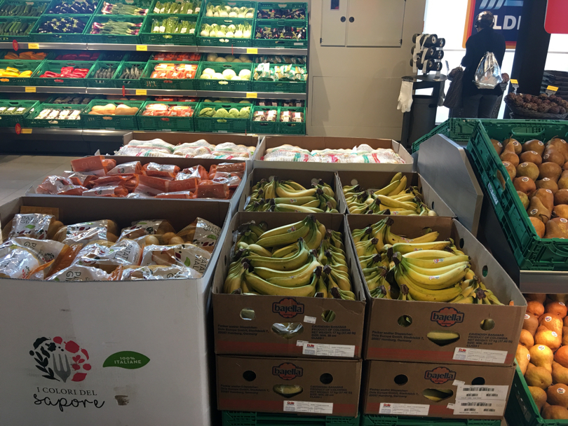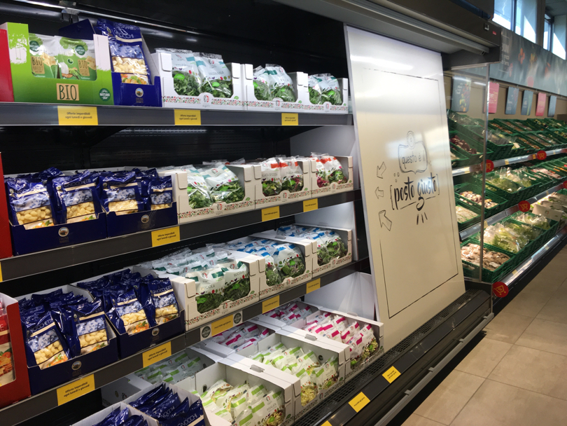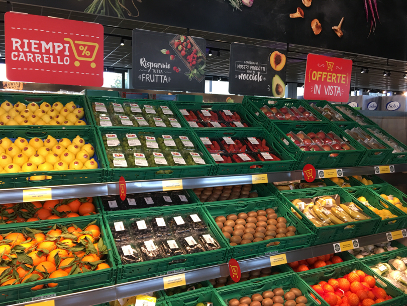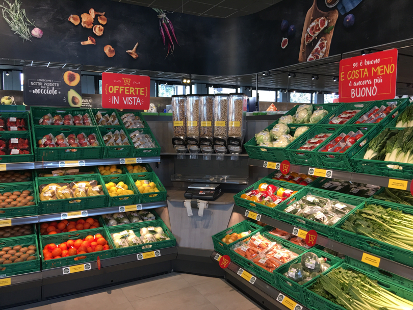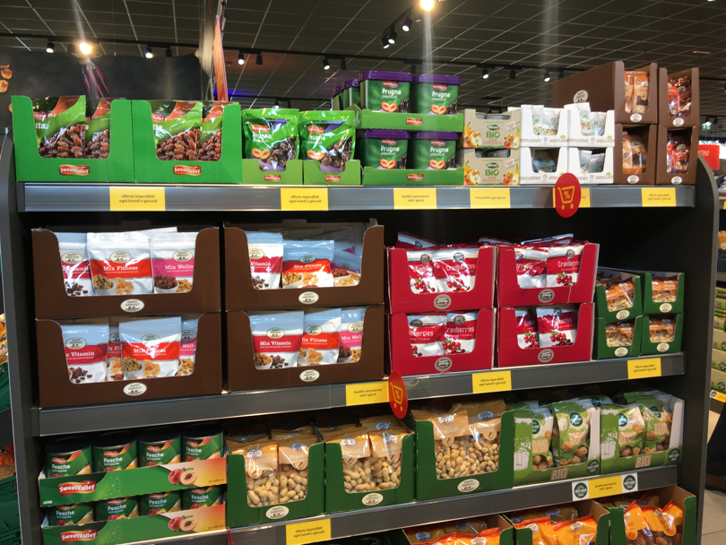 Pochi marchi noti, tanti prodotti a marchio, alcuni di linee come quella denominata “Natura Felice”, riservata al biologico, enfasi su italianità e origine del prodotto, concetto che nel reparto ortofrutta, secondo il management tedesco, in Italia è fondamentale. Spazio contenuto per l’area convenience, al momento della visita ancora non completa ma che sarà importante e che completa il reparto. La frutta secca? Oltre ad una scaffalatura ad hoc, anche dei dispenser dai quali rifornirsi autonomamente posizionata in zona molto visibile.