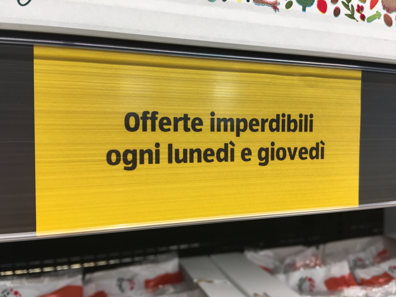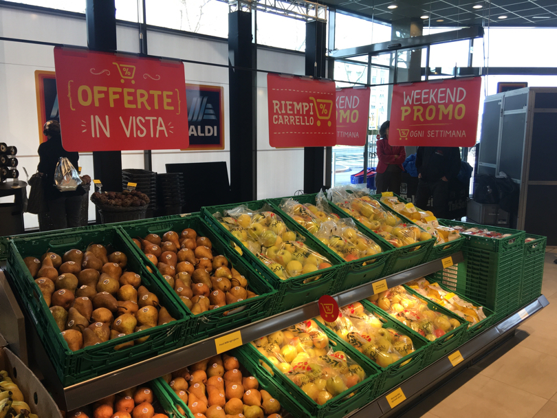 È la promessa fatta dal manager tedesco, più volte ribadita, incalzato dalle domande di molti giornalisti che volevano maggiori dettagli sulla strategia di Aldi in Italia. Prezzi esposti, al momento, non ce n’erano naturalmente, e sebbene Veiser abbia affermato che la leva del prezzo non sarà l’unica arma utilizzata per conquistare i consumatori italiani, l’impressione è che non sarà certo secondaria. Anzi. Ogni settimana, al lunedì e al giovedì 60 prodotti, a rotazione, saranno messi in promozione in appositi spazi, ma poi ce ne saranno altri anche nel fine settimana, pubblicizzati con i classici volantini che saranno uno dei principali strumenti di comunicazione da questo punto di vista.