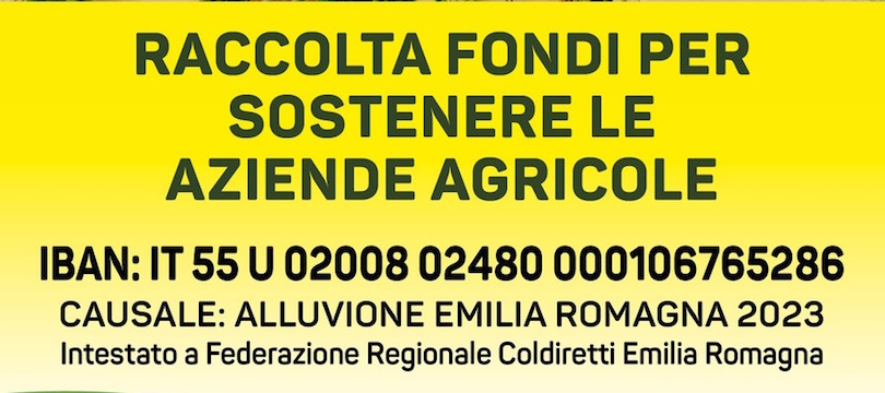 La Federazione Regionale di Coldiretti ha dato il via all’iniziativa di solidarietà Salviamo le nostre campagne. Iban: IT 55 U 02008 02480 000106765286, intestato a Federazione Regionale Coldiretti Emilia Romagna con causale alluvione Emilia-Romagna 2023.