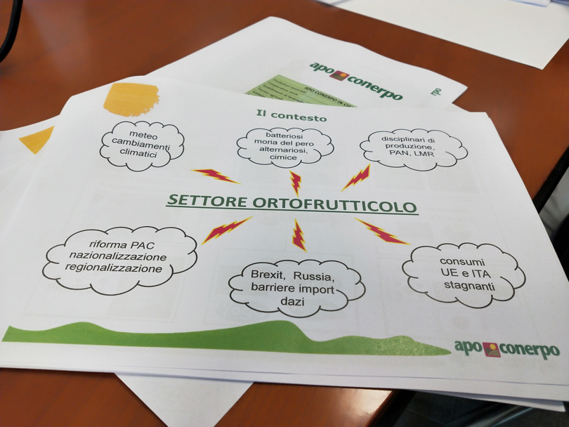 Una delle slide distribuite ai giornalisti, durante la conferenza stampa sui dati di bilancio 2018 della più importante organizzazione europea di produttori di ortofrutta fresca, è ricca di fulmini. Rappresentano i tanti pericoli che bisogna tentare di schivare nel contesto attuale del mercato ortofrutticolo.