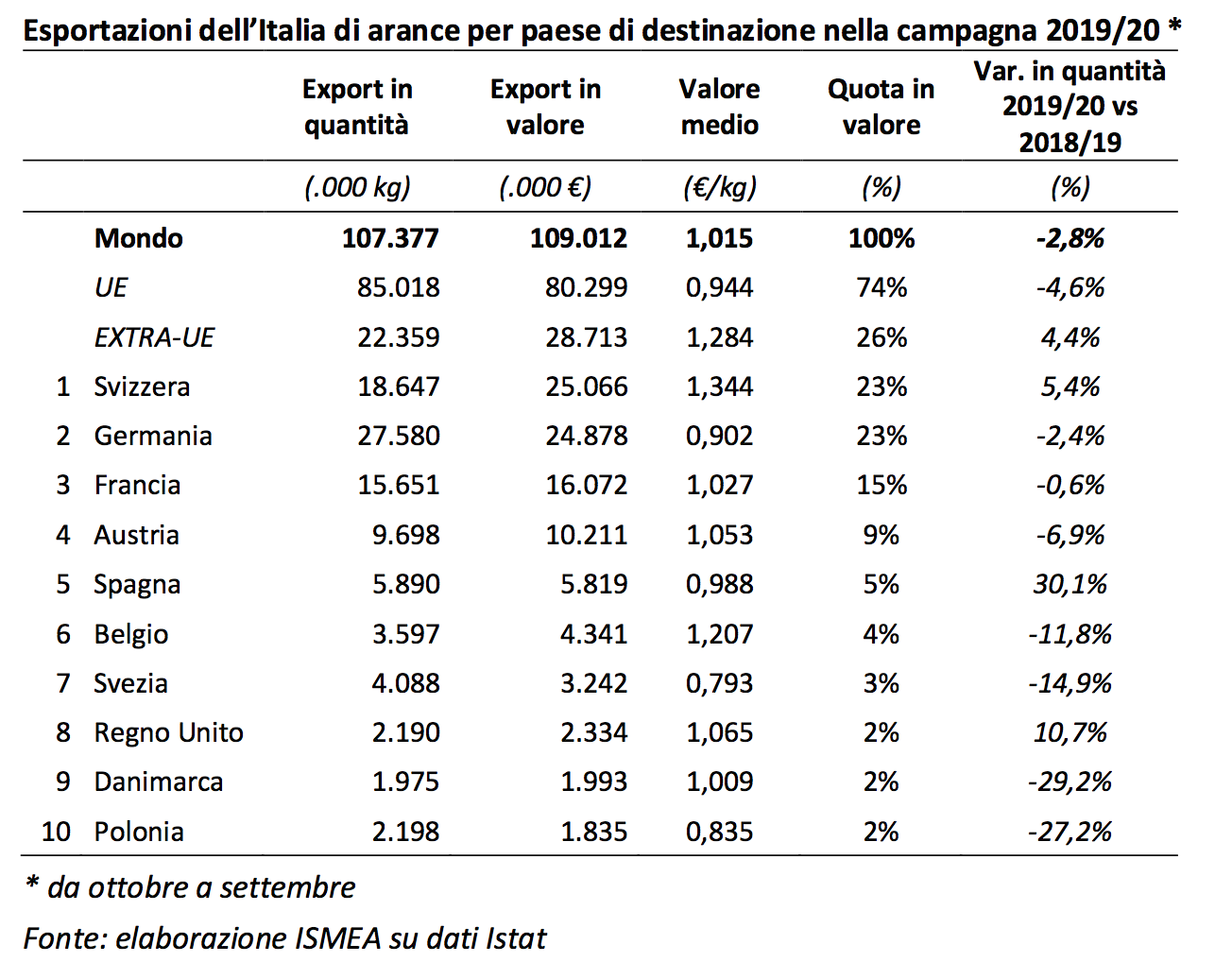 Infine, le esportazioni. La Svizzera, nella campagna 2019-20, ha rappresentato il primo mercato di riferimento, scavalcando la Germania. Quest'ultima, insieme a Francia, Austria, Belgio, Svezia, Danimarca e Polonia, ha fatto registrare le maggiori contrazioni delle importazioni dall’Italia. Di contro, Spagna e Regno Unito, hanno accresciuto le forniture di arance italiane.