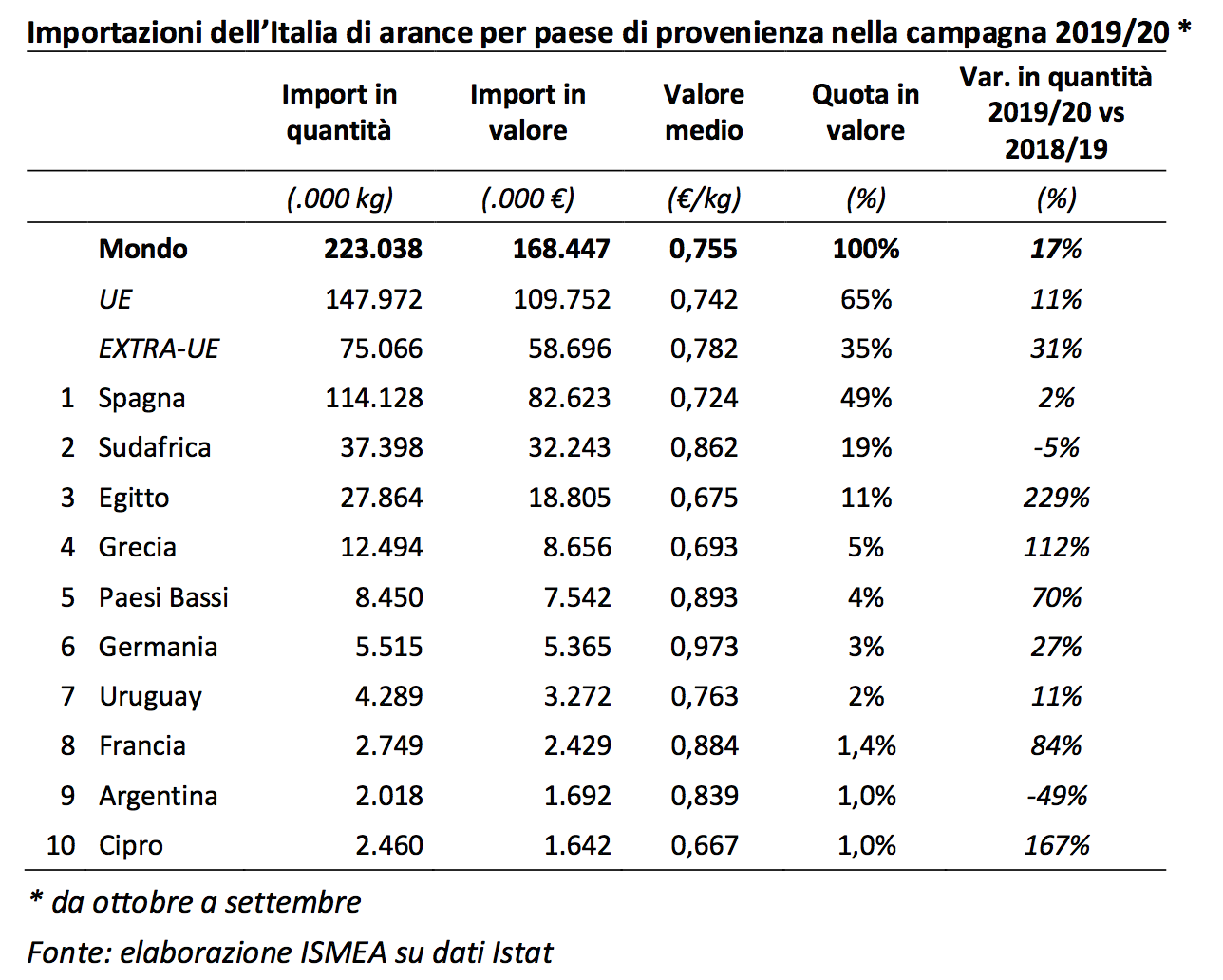 L’incremento delle importazioni italiane di arance è riconducibile soprattutto all’aumento dell’approvvigionamento di prodotto durante i mesi del primo lockdown nazionale (tra marzo e maggio 2020), con importazioni triplicate dall’Egitto e raddoppiate dalla Grecia.