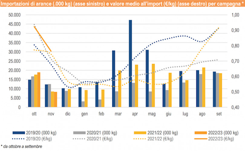 I dati relativi ai primi due mesi della campagna in corso, coerentemente alla scarsa disponibilità di prodotto nazionale, restituiscono un forte aumento delle importazioni di arance e il calo delle spedizioni verso l’estero.