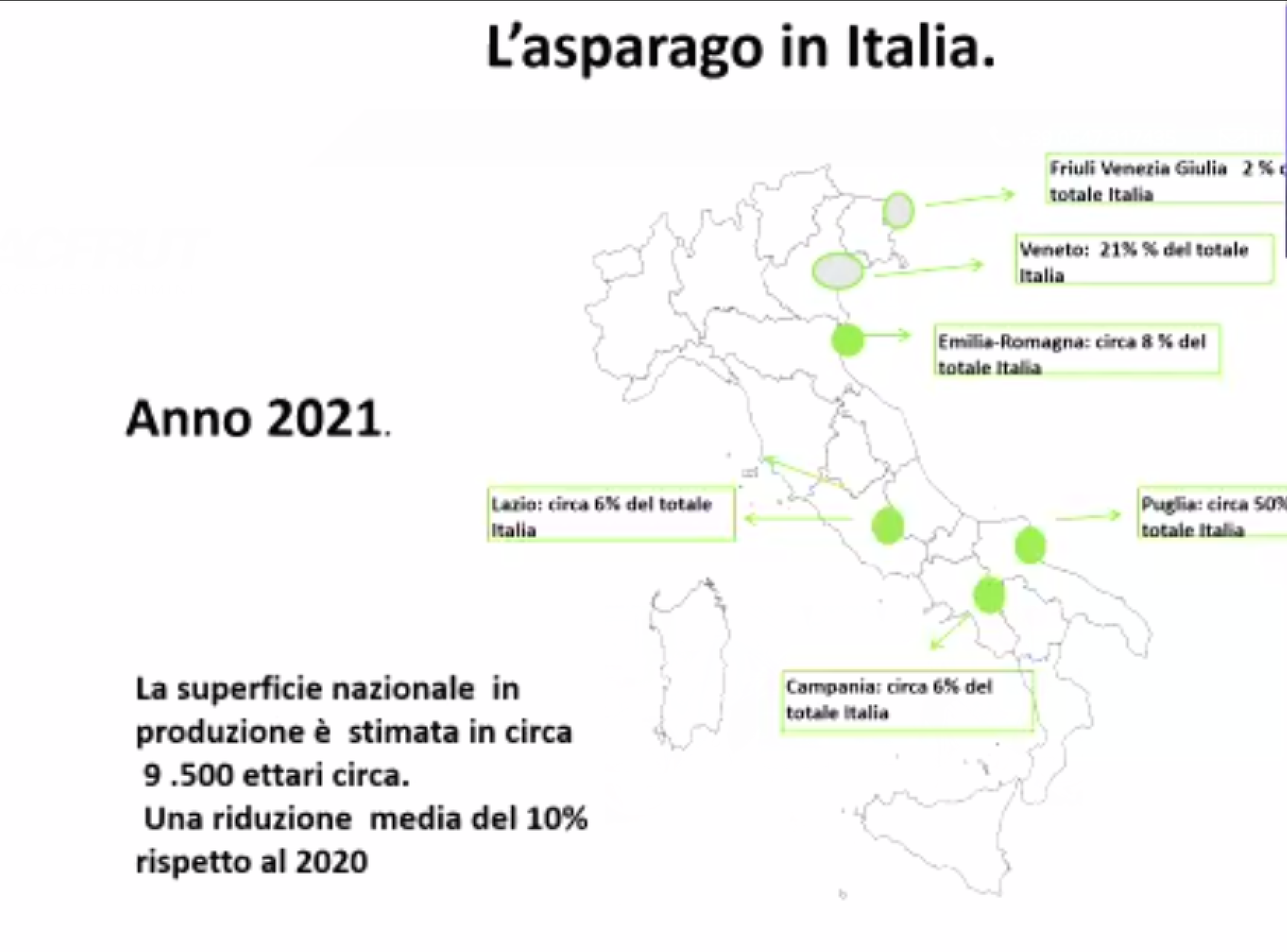 In Italia la produzione dell’asparago si estende su una superficie di circa 9.500 ettari concentrata in Puglia (circa il 50% del totale), Veneto (21%) ed Emilia Romagna (circa 8%). Rispetto allo scorso anno si è registrato un calo produttivo di circa il 10 per cento: “Il 2021 è stato un anno difficile per via dell'andamento climatico – ha commentato Trentini – Gli abbassamenti termici e le abbondanti piogge hanno, come già accaduto nel 2020, ritardato la raccolta e compromesso le rese produttive. L’asparago comunque mantiene un trend positivo sotto il profilo commerciale, cresce la domanda da parte dei consumatori per tutte le tipologie, in particolare le varietà verdi“. In aumento anche domanda di asparagi verdi per il mercato estero, meglio se biologici. Gli asparagi bianchi oggi rappresentano poco meno del 20% dell’intera superficie nazionale e sono presenti solo in due regioni italiane, Veneto e Friuli Venezia Giulia. Gli asparagi viola (il più conosciuto è il Violetto d’Albenga) sono coltivati quasi esclusivamente in Liguria. A trainare la produzione nazionale sono gli asparagi verdi pugliesi, che rappresentano ancora livelli produttivi superiori ai cinquemila ettari. In Campania la coltura interessa oltre 400 ettari di asparagi verdi coltivati prevalentemente in serra.