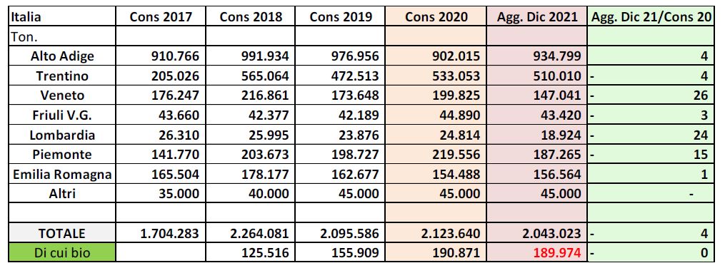 Il Comitato marketing ha analizzato anche la situazione del settore biologico, che arriva a 189.974 tonnellate di produzione, in perfetto allineamento con il 2020.
