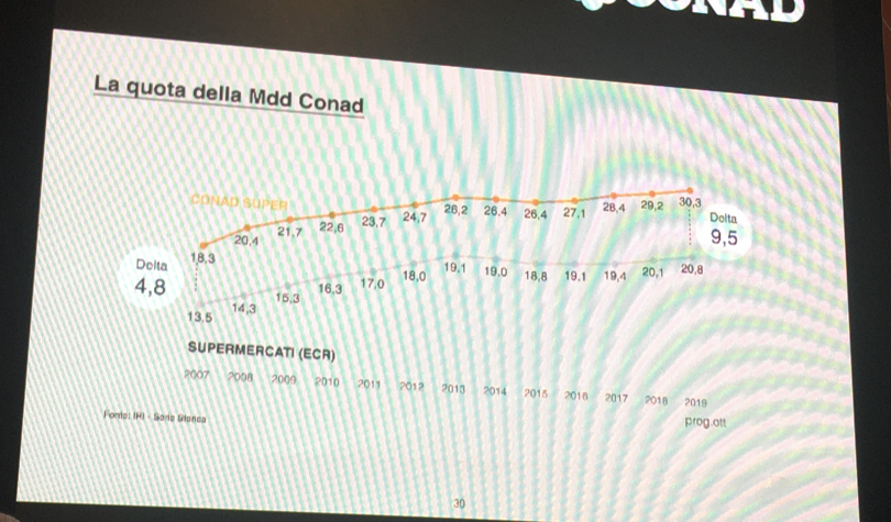 Per quanto riguarda i prodotti a marchio, Conad intende continuare a investire. I numeri, d'altronde, sono importanti: valgono quasi 4 miliardi del fatturato totale del 2019, crescono a valore dell'8% e pesano più del 40% della crescita di tutta la marca Commerciale in Italia. Non a caso la quota di mercato dei prodotti a marchio in Conad è al 30,3% contro una media del 20,8% in Italia.