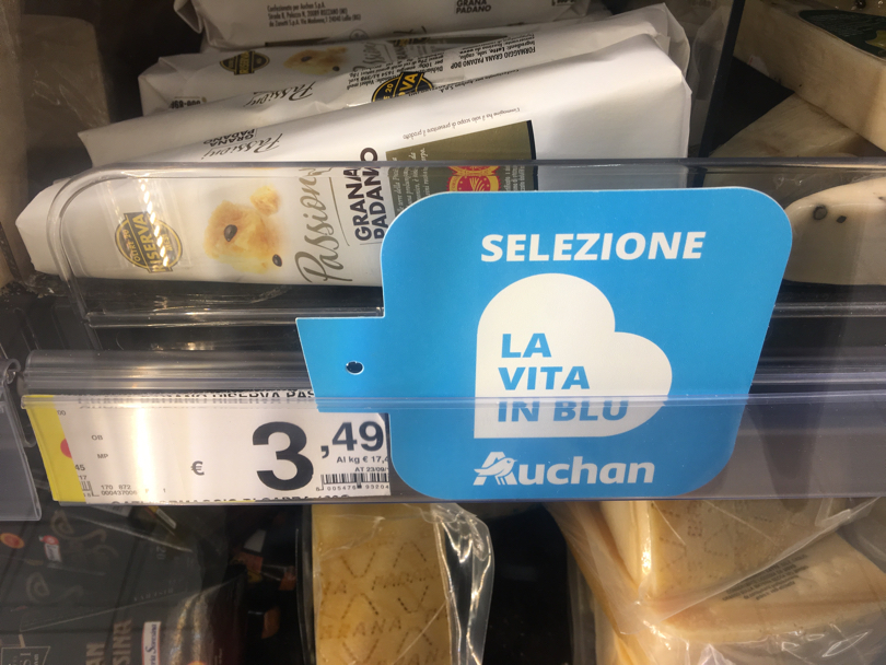 Nelle foto in alto, scattate da myfruit poco dopo il lancio dell'iniziativa, il cartello presente all'ingresso di un punto vendita Auchan (Cesano Boscone, in provincia di Milano) e due esempi di prodotti contrassegnati con il bollino blu.