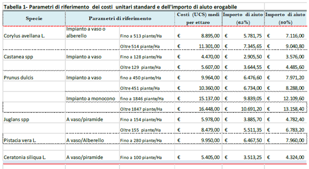 Primo, la realizzazione di nuovi impianti e reimpianti nell’ambito delle specie afferenti alla filiera della frutta a guscio; con un contributo del 65%, incrementato all’80% se giovane agricoltore, del valore del costo standard ritenuto ammissibile per ogni specie ed indicati nel modello di domanda.