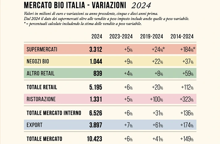 Numeri senz’altro positivi quelli che emergono dal Focus Bio Bank - Supermercati & Specializzati 2025, liberamente consultabile su issuu.com/biobank. Il mercato del bio italiano ha infatti raggiunto 10,4 miliardi nel 2024, tra retail, ristorazione ed export, con una crescita del 6% rispetto all’anno precedente.