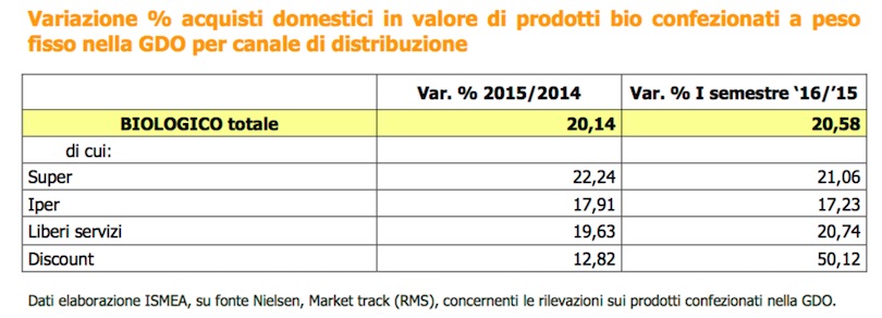 Crescono un po' tutti i canali di vendita, compresi i discount che nel primo semestre del 2016 fa segnare un incremento di oltre il 50% rispetto allo stesso periodo dell'anno scorso. “Si tratta di un aspetto che deve essere ben interpretato – sottolinea sempre la nota del Sinab: “i metri lineari messi a disposizione per le referenze biologiche dai punti vendita stanno via via crescendo e questo fenomeno semplifica la vita al consumatore abituale e, allo stesso tempo, stimola anche l’acquisto occasionale e d’impulso”.
