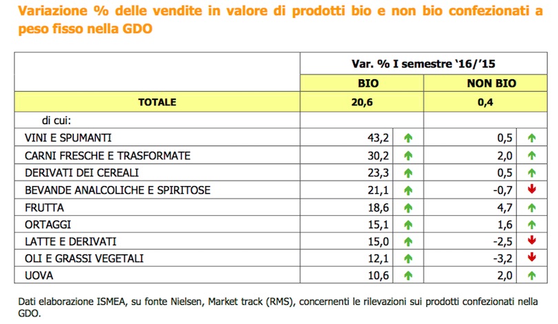 Se nel 2015 il comparto ha fatto registrare un aumento delle vendite complessive del 20%, nel primo semestre 2016 si conferma la crescita due cifre, pari al 20,6%. Nella Gdo aumento lo spazio a scaffale dedicato a questi alimenti e, a parità di referenze, se alcuni prodotti convenzionali appaiono in crisi – vedi latte o olio per esempio – i rispettivi biologici hanno invece segno positivo, “segno che il consumatore riconosce a questi prodotti un oggettivo plus rispetto al convenzionale” si legge nel rapporto del Sinab.