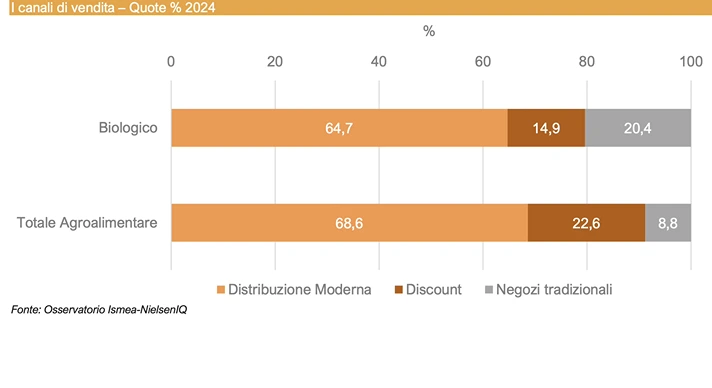 La distribuzione moderna si conferma, anche per il 2024, il canale distributivo preferito dai consumatori italiani per l’acquisto di prodotti biologici che raggiunge un fatturato di 2,5 miliardi registrando un incremento degli incassi di biologico di oltre 78 milioni (+3,2%) sull’anno precedente, il più alto in termini assoluti tra i canali distributivi.