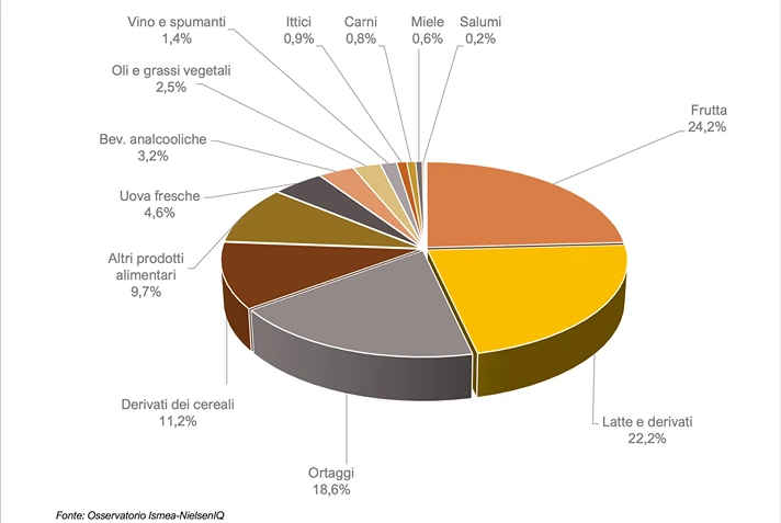 Si consolida, inoltre, anche la crescita degli acquisti di prodotti biologici in volume (+4,3% sul 2023) con una intensità superiore a quella registrata in valore a conferma di una dinamica generalmente più contenuta dei prezzi medi allo scaffale per molti prodotti biologici.