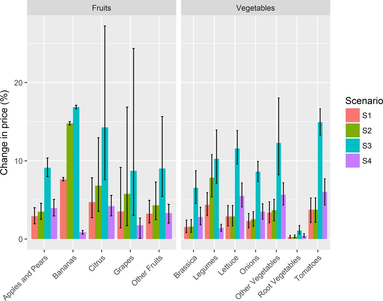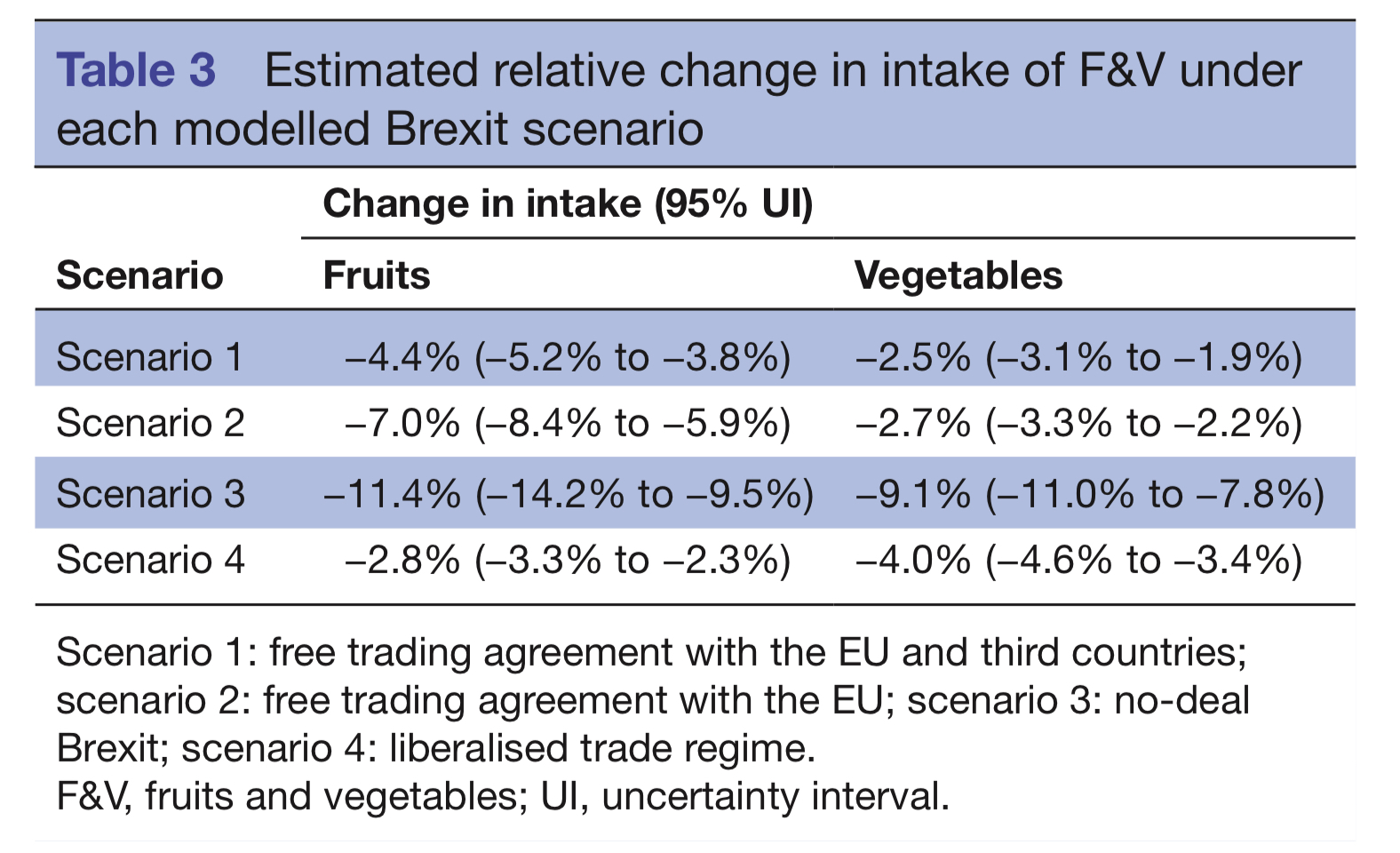 In realtà i ricercatori hanno studiato gli impatti sull'assunzione di frutta e verdura in Inghilterra secondo quattro differenti scenari che prendono in considerazione la possibilità di un accordo di libero scambio con l'UE e il mantenimento della metà dei partner di libero scambio non UE, un accordo di libero scambio con l'UE, ma nessun accordo commerciale con i paesi terzi, il “no deal Brexit” e infine un regime commerciale liberalizzato che elimina tutti i dazi all'importazione.