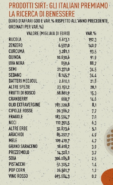 La tabella riportata qui in alto (che prende in considerazione una serie di alimenti consigliati dalla dieta Sirt, che promette di far perdere 3,5 chilogrammi in sette giorni mangiando frutta e verdura) certamente esplicativa del boom in atto, che durante la presentazione milanese è stato definito “inatteso”. Quanto durerà la crescita di questi alimenti non è dato sapere. Gli italiani, come più volte sottolineato nel rapporto, amano sperimentare, quindi…