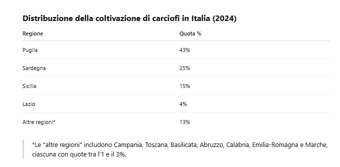 Secondo Elisa Macchi, direttore di CSO Italy. "Quattro regioni concentrano oggi quasi il 90% della coltivazione del carciofo in Italia: Puglia (43%), Sardegna (25%), Sicilia (15%) e Lazio (4%). Campania, Toscana, Basilicata, Abruzzo, Calabria, Emilia Romagna e Marche rappresentano ciascuna quote variabili tra l'1 e il 3%".